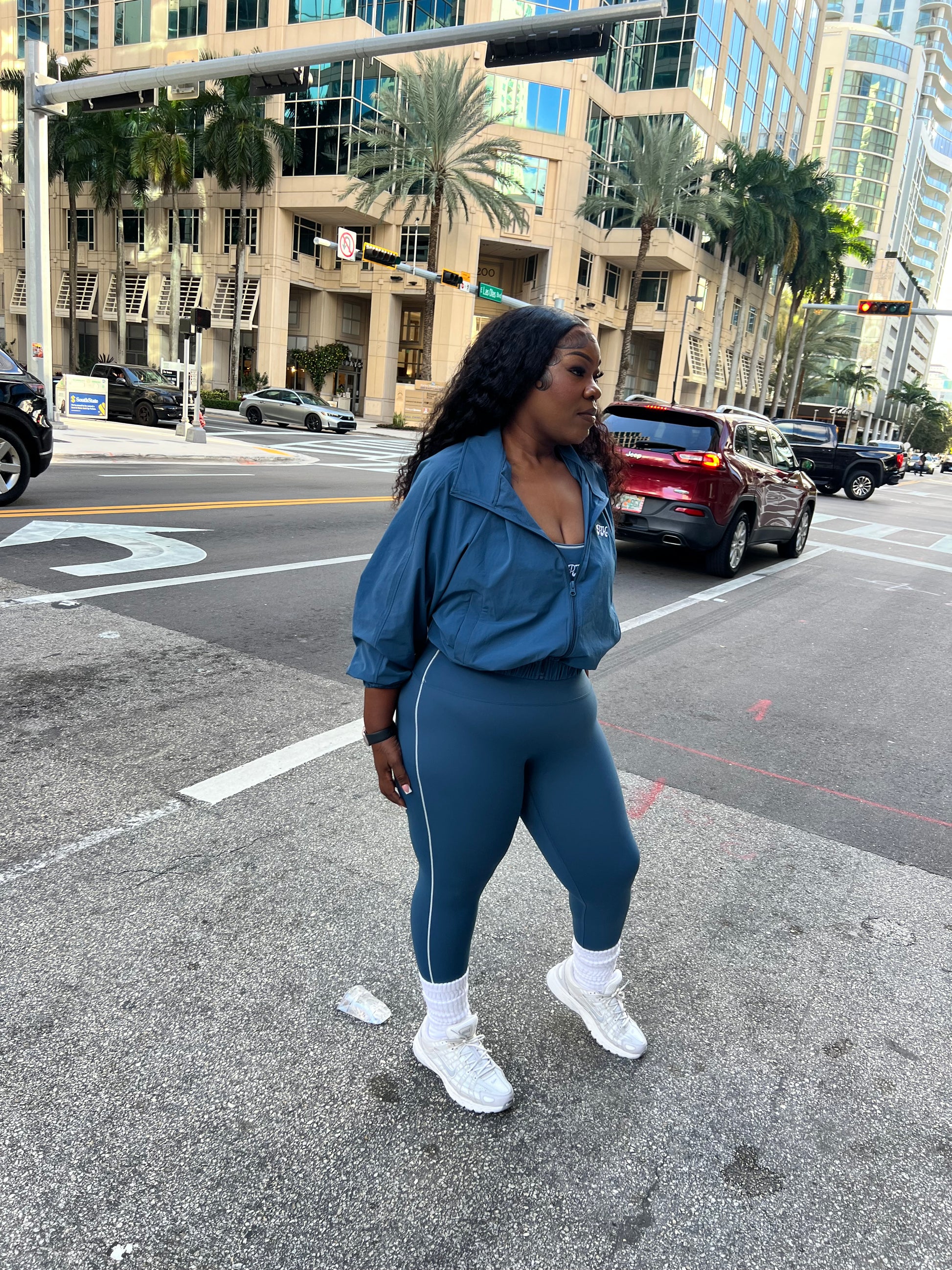 This complete three-piece set features high-compression leggings contour and smooth with a waist-snatching band for a naturally flattering shape. The supportive sports bra offers clean, minimal lines and a secure feel for training or daily movement. This trendy crop jacket that offers a flattering fit